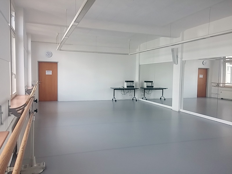 Hier stehen uns 2 geräumige Säle ohne Säulen zur Verfügung, die selbstverständlich mit Schwingböden, Spiegelwand und Ballettstangen ausgestattet sind. Die hochwertigen Musikanlagen werden durch spezielle Akustik-Dämmplatten ergänzt, die den Hall reduzieren und für eine angenehme Audio-Atmosphäre sorgen.